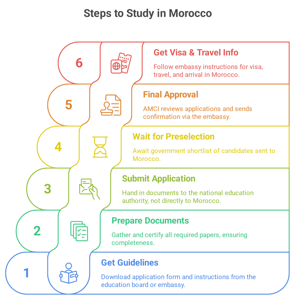 - Submit to National Authority: Hand in your documents to your country’s Ministry of Education or scholarship office. Do not send them directly to Morocco.